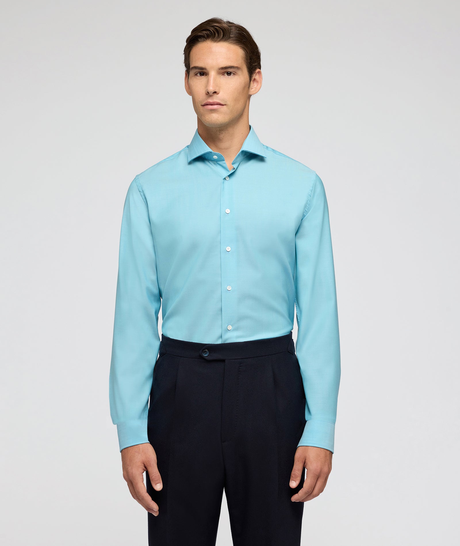 Made-to-Measure shirt in a wool and cashmere blend in light blue tones. The fabric is from the Reda wool mill, Reda Active line, known for its high performance in terms of elasticity and breathability, ensuring exceptional comfort.