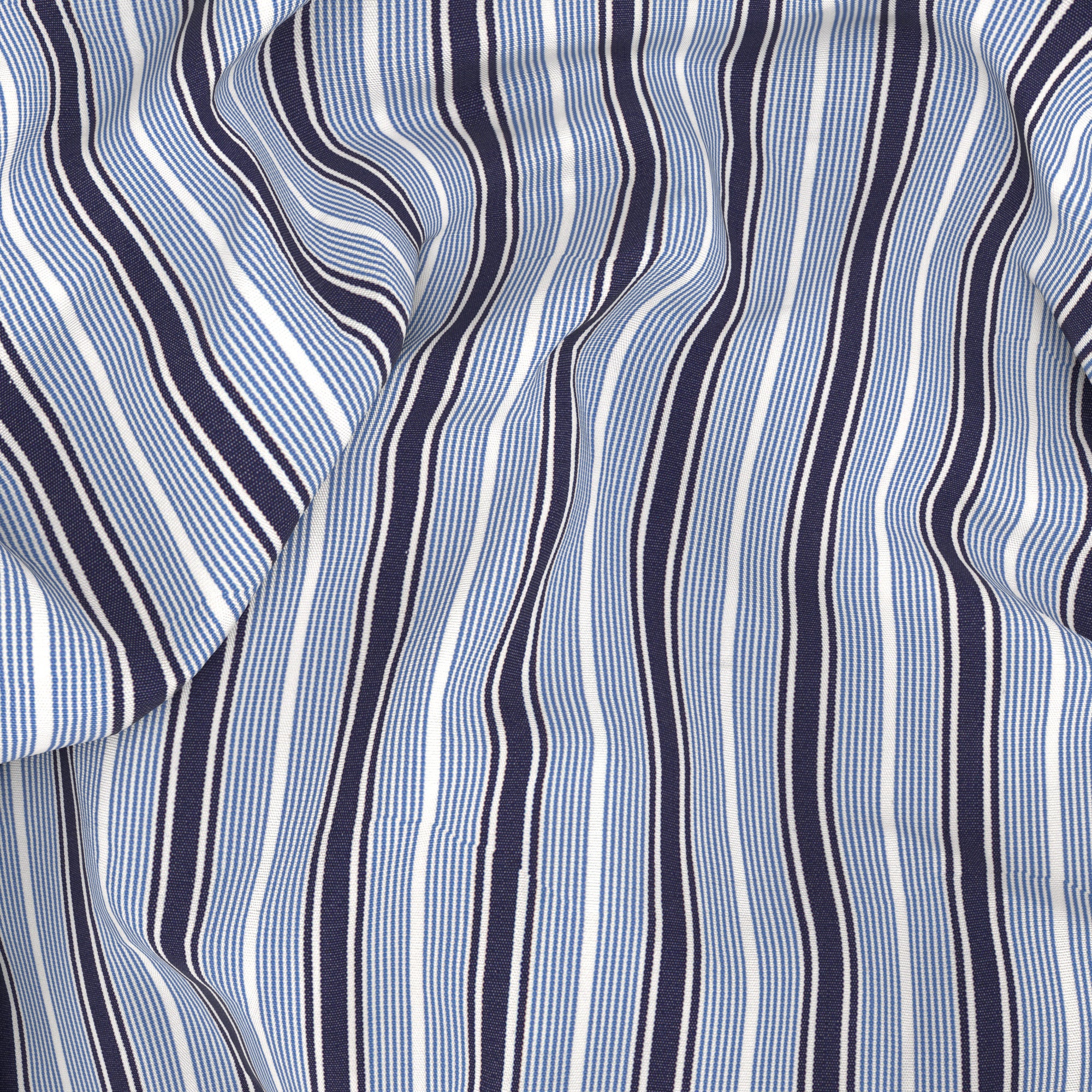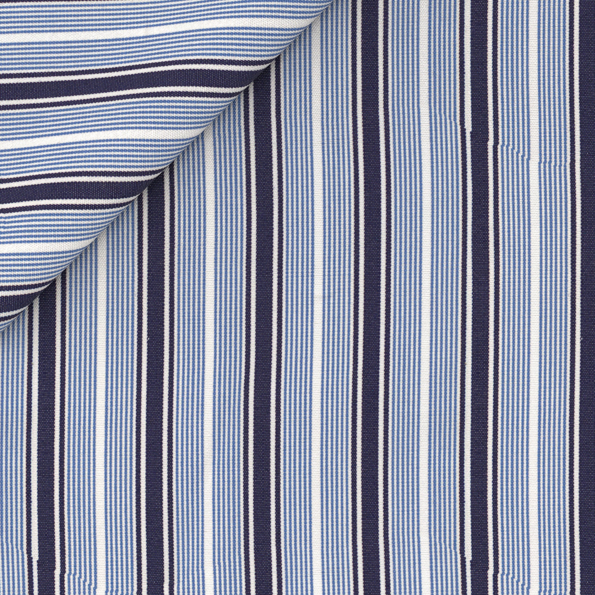 Camisa A Medida confeccionada en algodón de Thomas Mason con una fantasía a rayas azul y azul claro. Diseñada para looks de negocio, para llevar junto con chaqueta y corbata, como una alternativa a la clásica camisa blanca.