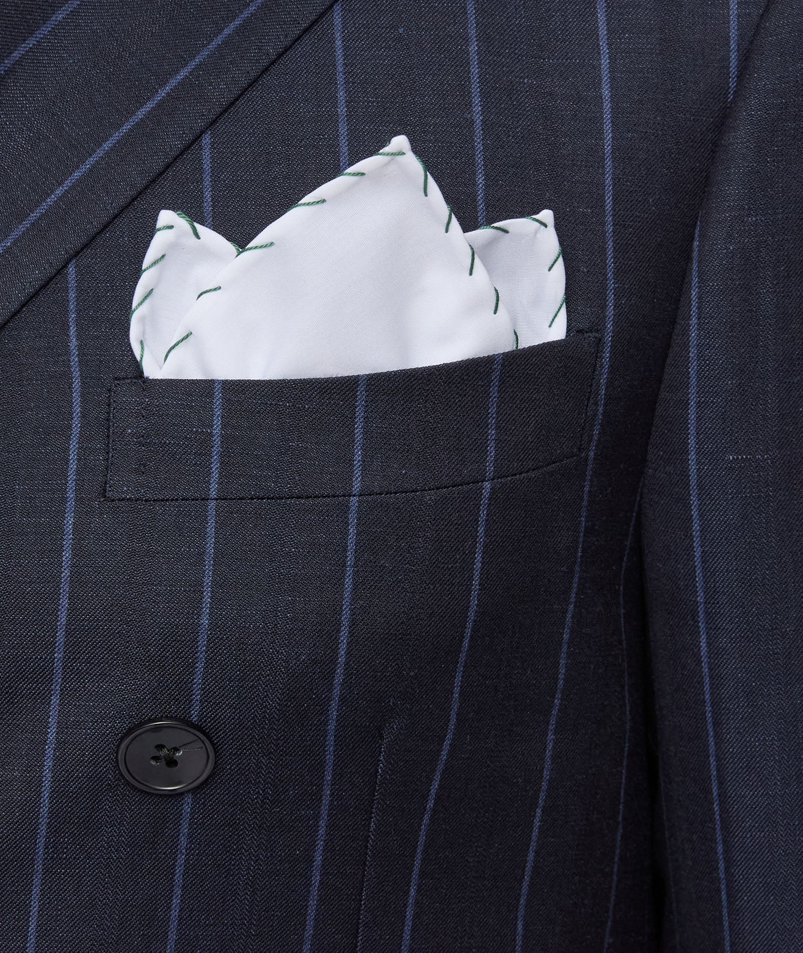 Pochette en coton confectionnée en Italie. Forme carrée, agrémentée d'un ourlet vert. À porter dans la poche poitrine d'une veste ou d'un blazer pour une touche de style supplémentaire.